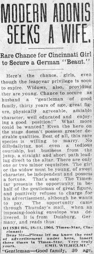MODERN ADONIS SEEKS A WIFE.