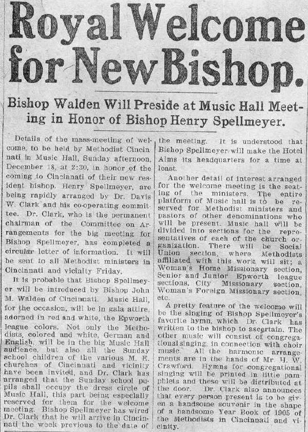 It is probable that Bishop Spellmeyer will be introduced by Bishop John M. Walden of Cincinnati Music Hall, for the occasion, will be in gala attire, adorned in red and white, the Epworth League colors. Not only the Methodists, colored and white, German and English, will be in the big Music Hall audience, but also all the Sunday school children of the various M. E. churches of Cincinnati and vicinity have been invited, and Dr. Clark has arranged that the Sunday school pupils shall occupy the dress circle of Music Hall, this part being especially reserved for them for the welcome meeting. Bishop Spellmeyer has wired Dr. Clark that he will arrive in Cincinnati the week previous to the date of the meeting. It is understood that Bishop Spellmeyer will make the Hotel Alms its headquarters for a time at least.