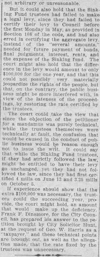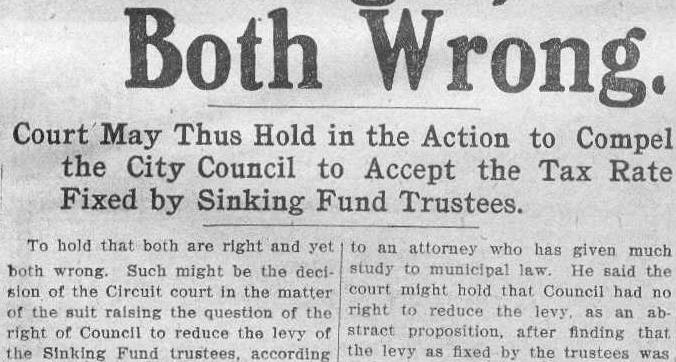 To hold that both are right and yet both wrong. Such might be the decision of the Circuit court in the matter of the suit raising the question of the right of Council to reduce the levy of the Sinking Fund trustees, according not arbitrary to an attorney who has given much study to municipal law. He said the court might hold that Council had no right to reduce the levy, as an abstract proposition, after finding that the levy as fixed by the trustees was not arbitrary or unreasonable.