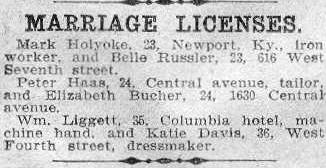 Ky., iron worker, and Belle Russler, 23, 616 West Seventh