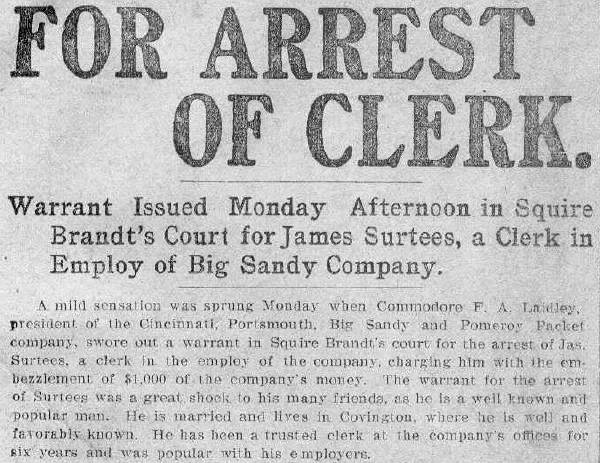 Portsmouth, Big Sandy and Pomery Packet company, swore out a warrant in