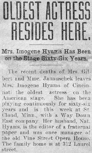 leaves Mrs. Imogene Hyams of Cincinnati the oldest actress on the
