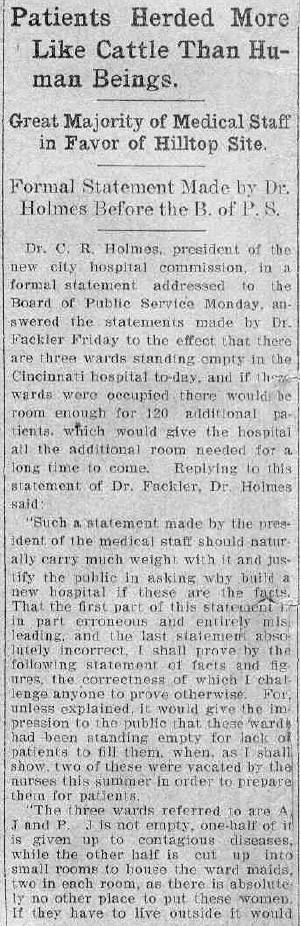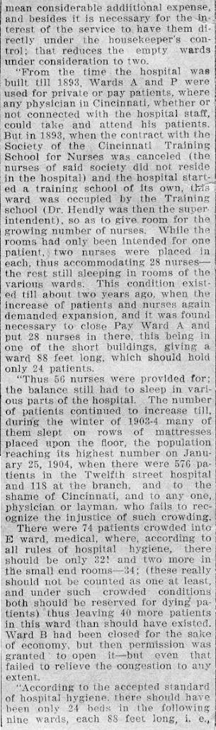 “Thus 56 nurses were provided for; the balance still had to sleep in various parts of he hospital. The number of patients continued to increase till, during the winter of 1903-4 many of them slept on rows of mattresses placed upon the floor, the population reaching its highest number on January 25, 1904, when there were 576 patients in the Twelfth street hospital and 118 at the branch, and to the shame of Cincinnati, and to any one, physician or layman, who fails to recognize the injustice of such crowding.