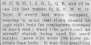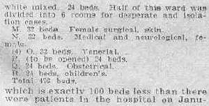 There were 74 patients crowded into E ward, medical, where, according to all rules of hospital hygiene, there should be only 32! And two more in the small en d rooms—34; (these really should not be counted as one at least and under such crowded conditions both should be reserved for dying patients) thus leaving 40 more patients in this ward than should have existed. Ward B had been closed for the sake of economy, but then permission was granted to open it—but even that failed to relieve the congestion to any extent.