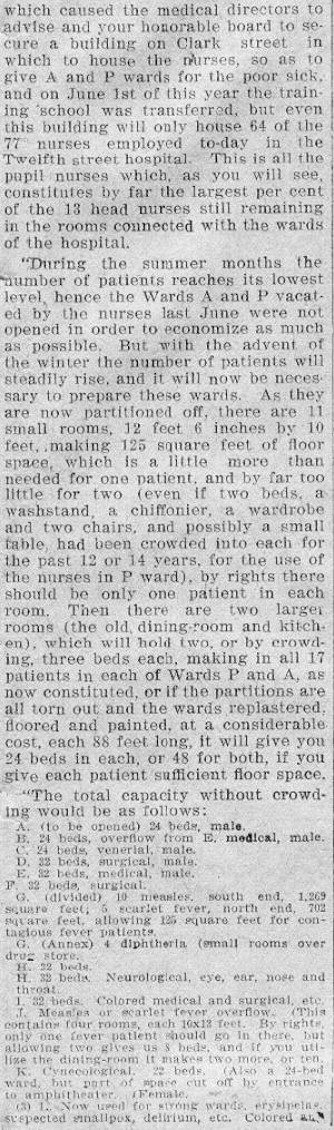 “According to the accepted standard of hospital hygiene, there should have been only 24 beds in the following nine wards, each 88 feet long, i. e., B, C, G, H, I, J, K, L, Q, R, and 32 in the 118 feet wards, D, E, F, M, N, O. Now if every bed were occupied bearing in mind that there should be only eight beds for contagious diseases in south end J ward (the north end, as already stated, being used for ward maids), there still were 190 more patients than beds. It was this condition which caused the medical directors to advise and your honorable board to secure a building on Clark street in which to house the nurses, so as to give A and P wards for the poor sick, and on June 1st of this year the training school was transferred, but even this building will only house 64 of the 77 nurses employed to-day in the Twelfth street hospital. This is all the pupil nurses which, as you will see, constitutes by far the largest per cent of the 13 head nurses still remaining in the rooms connected with the wards of the hospital.