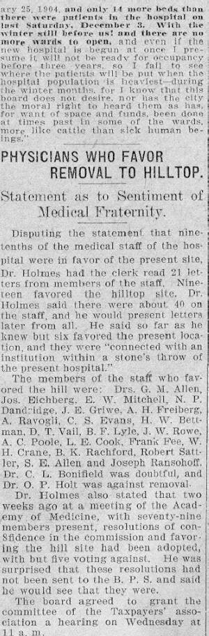 Disputing the statement that nine-tenths of the medical staff of the hospital were in favor of the present site, Dr. Holmes had the a clerk read 21 letters from the members of the staff. Nineteen favored the hilltop site. Dr. Holmes said there were about 40 on the staff, and he would present letters later from all. He said so far as he knew but six favored the present location, and they were “connected with an institution within a stone’s throw of the present hospital.”