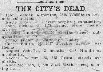 Katie Brose, 25, Christ hospital; exhaustion. John Fisher, 46, 2178 Armor place; meningitis. Charles Gulden, 50, 201 Goethe street; pulmon[?] Frank Thole, 32, Wade and Dudley. Carrie Smith, 29, 1037 Foraker avenue; asthenia. August Scheffel, 3 months, 4148 Hamilton; meningitis. Rachel Jackson, 65, 525 George street; nephritis. Alice McClain, 1, 550 West Sixth street; meningiti |
