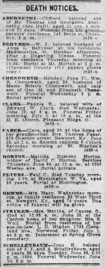FABER -- Clara, aged 20, at the home of her grandmother, Mrs. Theressa Faber, 818 Overton street, Newport, Ky., June 29, at 2 a.m. Solemn requiem 9 o'clock Saturday morning at St. Stephen's church.