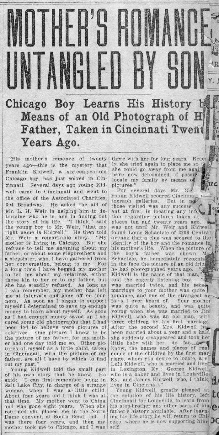 For several days Mr. Weir and young Kidwell scoured Cincinnati photograph galleries. But in no (unreadable) those visited was any success ?ant at first in locating any information regarding pictures taken at places ten and twenty years ago. It was not until Mr. Weir and Kidwell found Louis Schaetzle of 2206 Central avenue that a clue was secured to the identity of the boy and the romance in his mother's life. When the picture of the boy's father was shown Mr. Schaetzle, he immediately recognized in the face of the picture of an old friend he had photographed years ago. "Jim Kidwell is the name of that man," he told the eagerly listening boy, "he was married twice, and his second marriage to your mother was quite a romance, and one of the strangest affairs I have heard of. Your mother was quite a beauty, and was quite young when she was married to Jim Kidwell, who was an old man, with three children by his first marriage. After the second Mrs. Kidwell had been married about a year and half, she suddenly disappeared and took her little baby with her. As far as I know, the names and places of residence of the children by the first marriage whom you desire to locate, are Lula Kidwell, who is married and living in Lexington, Ky.; George Kidwell, who is a baker and lives in Louisville, Ky., and James Kidwell who I think, lives in Cincinnati."