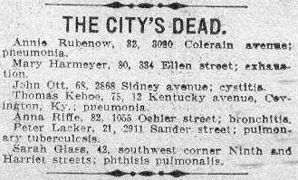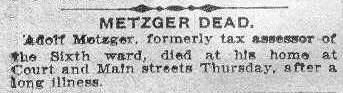 32, 3020 Colerain avenue; pneumonia. Mary Harmeyer, 80, 334 Ellen street; exhaustion. John Ott, 68, 2868 Sidney avenue; cystitis. Thomas Kehoe, 75, 12 Kentucky avenue, Covington, Ky.; pneumonia. Anna Riffe, 82, 1055 Oehler street; bronchitis. Peter Lacker 21, 2911 Oehler street; pulmonary tuberculosis. Sarah Glass, 42, southwest corner Ninth and Harriet streets; phthisis pulmonalis. METGER DEAD. Adoff Metger, formerly tax assessor of the Sixth ward, died at his home at Court and Main streets Thrusday, after a long illness |