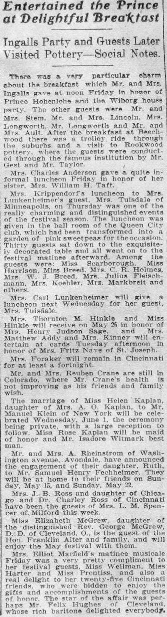 There was a very particular charm about the breakfast which Mr. and Mrs. Ingalls gave at noon Friday in horor of Prince Hohenlohe and the Wiborg house party. The other guests were Mr. and Mrs. Stem, Mr. and Mrs. Lincoln, Mrs. Longworth, Mr. Longworth and Mr. and Mrs. Ault. After breakfast at Beechwook there was a trolley ride through the suburbs and a visit to Rookwood pottery, where the guests were conducted through the famous institution by Mr. Gest and Mr. Taylor.
