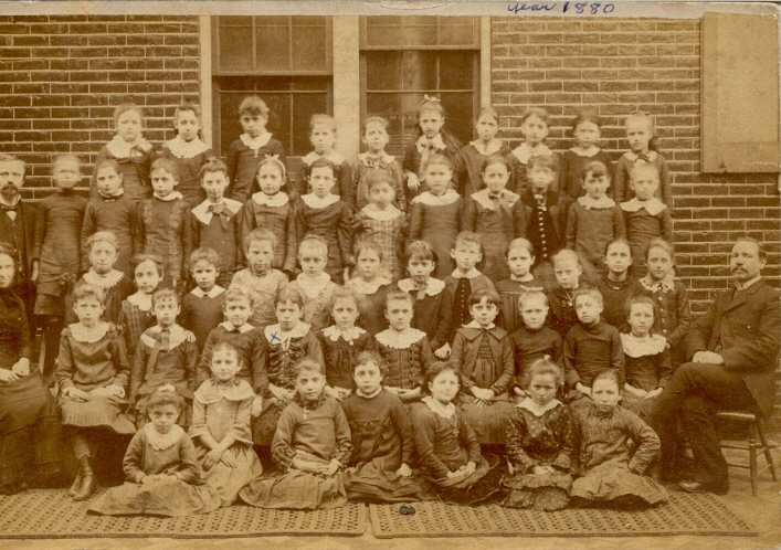 Additional information is that the photo was taken in 1880. My grandmother Miss Elizabeth May Gerhardt was 6 at the time. She is in the second row with an ink "X" marked on her collar. I would imagine the other children are about the same age. Her parents lived at 237 Pleasant St. in 1880 according to the Census. That is all I know about the photo or the people in it. I would love to find out more.