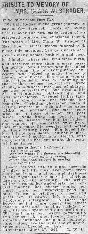 friend. The death of Mrs. Clara W. Strader of East Fourth street,