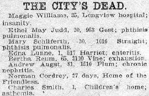 Ethel May JUDD, 20, 953 Gest; phthisis pulmonalis. Mary SCHILFERTH, 20, 1016 Straight; phthisis pulmonalis. Edna LUNNE, 1, 517 Harriet; enteritis. Bertha REUM, 65, 3110 Vine; exhaustion. Andrew AUGST, 81, 1510 Plum; chronic nephritis. Norman CORDREY, 27 days, Home of the Friendless. Charles SMITH, 1, Children's home; asthemia |