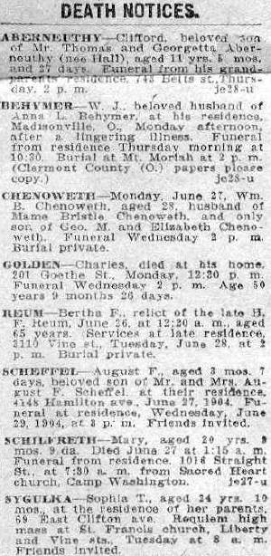 SCHILFRETH - Mary, aged 20 yrs. 9 mos. 9 da. Died June 27 at 1:15 a.m. Funeral from residence. 1016 Straight St., at 7:30 a.m. from Sacred Heart church, Camp Washington.