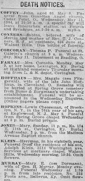 COFFEY -- John, aged 60, May 8. Funeral from Guardian Angel church. Cedar Point, O., Wednesday, May 11, 1904 at 10:30 a.m. a special car will leave Interurban station, at Fourth and Sycamore, at 3:30 a.m. my9-u