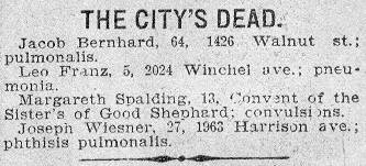 Leo Franz, 5, 2024 Winchel ave., pneumonia. Margareth Spalding, 13, Convent of the Sister's of Good Shephard: convulsions. Joseph Wiesner, 27, 1963 Harrison ave.; phthisis pulmonalis. |
