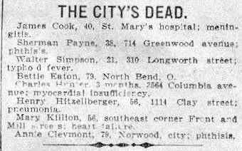 Sherman Payne, 38, 714 Greenwood avenue; phthisis. Walter Simpson, 21, 310 Longworth street; typhoid fever. Bettie Eaton, 79, North Bend, O. Charles Hunter, 3 months, 2564 Columbia avenue; myocardial insufficiency. Henry Hitzellberger, 56, 1114 Clay street; pneumonia Mary Killion, 56, southest corner Front and Mill streets; heart failure. Annie Clevmont, 79, Norwood, city; phthisis. |