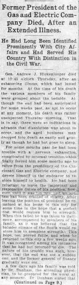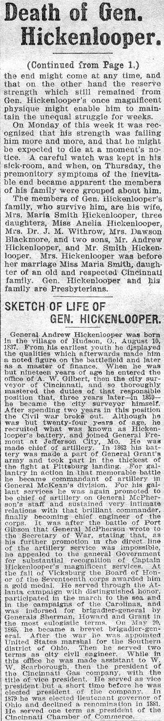 The members of Gen. Hickenlooper’s family, who survive him, are his wife, Mrs. Maria Smith Hickenlooper, three daughter, Miss Anelia Hickenlooper, Mrs. Dr. J. M. Withrow, Mrs. Dawson Blackmore, and two sons, Mr. Andrew Hickenlooper, and Mrs. Smith Hickenlooper. Mrs. Hickenlooper was before her marriage Miss Maria Smith, daughter of an old and respected Cincinnati family. Gen. Hickenlooper and his family are Presbyterians.