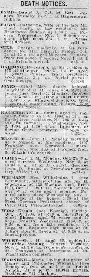 road, Price Hill, Oct. 30, 1904, at 12 o'clock at the age of 87 years