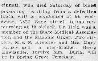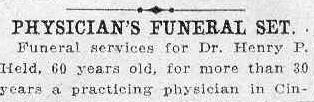Funeral services for Dr. Henry P. Held, 60 years old, for more than 30 years a practicing physician in cincinnati, who died Satyrday of blood poioning from a defective tooth, will be conducted at his residence, 1832 Race street, to-morrow morning at 10 o'clock. Dr. Held was a member of the State Medical Association and the Masonic Order. Two sisters, Mrs. S. Kreidler and Mrs. Mary Krause and a step-brother Georg Bowlander, survive him. Burial will be in Spring Grove Cemetery.