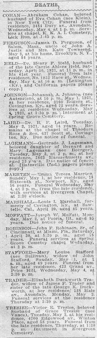 COHAN -- Abraham Cohan, beloved husband of Eva Cohan (nee Klein), in New York city, Funeral from residence 3484 Dury Av., Avondale, Wednesday, May 4, at 1 p. m. Services at chapel, K. K. A. I. Cemetery, Lick Run, at 1:45 p.m. FERGUSON -- James D. Ferguson, of Salem, Mass., uncle of John A. Justis and Mrs. Kate Townsend, May 3, at his home, Brooklyn, N. Y., aged 84 years. HELD -- Dr. Henry F. Held, husband of the late Carrie Ahlers Held, Saturday, April 30, 1921, at 11 p.m., in his 61st year. Funeral from late residence, No. 1832 Race st., Wednesday, May 4, 15 10 a.m. [Lexington (Ky.) and California papers please copy.] JOHNSON -- Johannah A. Johnson (nee Autenrieb), at 10 p.m., May 1, 1921, at her residence, 3100 Rogers st., Covington, Ky., aged 72 years. Services at residence Wednesday May 4, 1921, at 1:30 p. m. Interment at Spring Grove Cemetery. LAIRD -- Dr. B. F. Laird, Tuesday, May 3, 1921, aged 74 years. Remains at the chapel of Theodore Rose & Son, 637 Scott st., Covington, Ky. Due notice of funeral. LAGEMANN -- Gertrude J. Lagemann, beloved daughter of Bernard and Mary Langemann (nee Boerger), Tuesday, May 3, at 2 p.m., at her residence, 2863 Massachusetts av., aged 23 years. Due notice of funeral. [Batesville (Ind.) papers please copy.] MAERTEN -- Emma Teresa Maerten, Sunday, May 1, at her residence, 18 Sixteenth st., Newport, Ky., aged 56 years. Funeral Wednesday, May 4, at 2 p.m., from the late residence, with services at Evergreen Chapel at 2:30 o'clock. MARSHALL -- Louis I. Marshall, formerly of Convington, Ky., at Sawtelle, Cal., April 20, aged 85 years. MOFFATT -- Joseph W. Moffatt, Monday, May 2, at Peoria, Ill., aged 85 years. Due notice of funeral. ROBINSON -- John F. Robinson, Sr., of Cincinnati, at Miami Fla., Saturday, April 30, at 5:20 p.m., aged 78 years. Funeral services at Spring Grove Cemetery chapel Wednesday, at 3 p.m. STAFFORD -- Mary Louise Stafford (nee Sullivan), widow of John Stafford, Sunday, May 1 at 1 a.m., aged 69 years. Funeral from her late residence, 423 Grand av., Price Hill, Wednesday, May 4, at 2:30 p.m. TRADER -- Elizabeth Duckworth Trader, widow of James F. Trader and sister of late George K. Duckworth, at her residence, 538 Hale av., Avondale, Monday, May 2. Funeral services at the residence Thursday at 2:30 p. m. TRESISE -- Victor E. Tresise, beloved husband of Grace Tresise (nee Vance), Tuesday, May 3, at the residence 4700 Edgewood av., Winton Place, aged 58 years. Funeral from the late residence, Thursday, at 1:30 p.m. Interment in Evergreen Cemetery. |