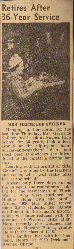 Retires After 36- Year Service Mrs. Gertrude Spilker Hanging up her apron for the last time Thursday, Mrs. Gertrude Spilker, head cook at Hughes High School for 36 years, took a look around at the piping-hot hamburger-and-spaghetti dish and roast beef sandwhiches she introduced to the cafeteria during her stay. Leaving with an armful of gifts, 'Gertie" was feted by the teachers and cooks, who "will really miss her at the school." Absent only three days during the 36 years, she remembers cooking for the servicement of World War I who were stationed at the Hughes along with the pupils. Around 1930 Mrs. silker served some 3,300 students, the highest enrollment in the school's history, which was later reduced with the erection of Western Hills High. More recently she watched her grandson, Howard Hauck, graduate with the class of 1946. Mrs. Spilker lives with her husband, Henry, at 2959 Deckebach Avenue, Clifton. |