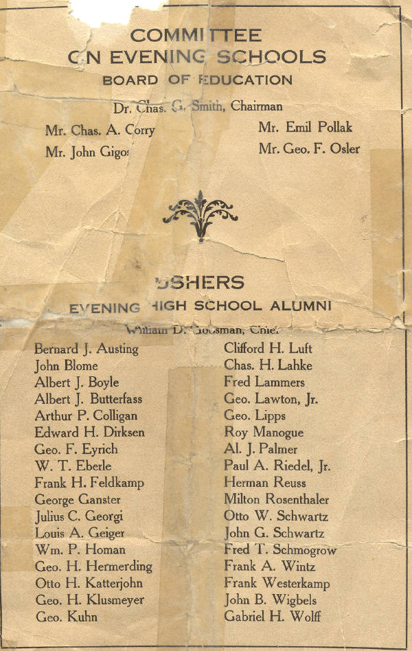 Albert Rodenberg. Kathryn Rottmueller. Blanche Schoneberger. E. Grace shaw. Carl F. Skahen. Genevieve Smith. Edw. F. Springmeier. Nettie Stark. Ernest W. Stockmeier. Eva J. Stout. Loretta Tully. Irene Vogelsang. Margaret Ward. Boyd Warren. A. H. Weingartner. F. W. Windmoeller. Frances Wolke. |