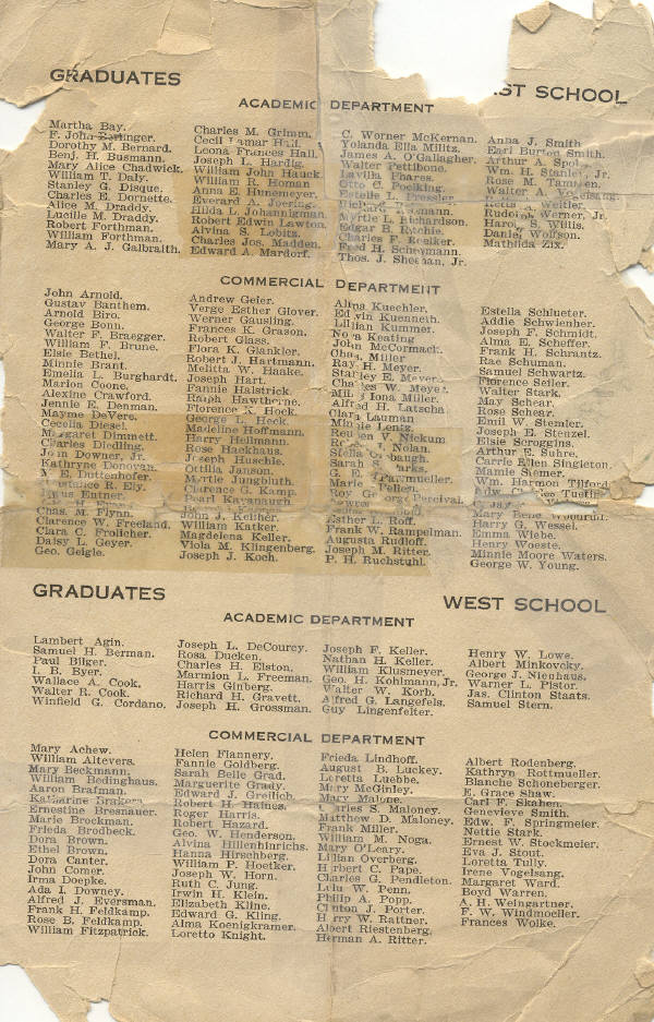 Estella Schlueter. Addie Schwienher. Joseph F. Schmidt. Alma E. Scheffer. Frank H. Schrantz. Rae Schuman. Samuel Schwartz. Florence Seiler. Walter Stark. May Schear. Rose Schear. Emil W. Stemler. Joseph E. Stenzel. Elsie Scroggins. Arthur E. Suhre. Carrie Ellen Singleton. Mamie Siemer. Wm. Harmon Tilford. Edw. Charles Tuetin?? C. Jay??? V??? Mary Bene Wood????. |